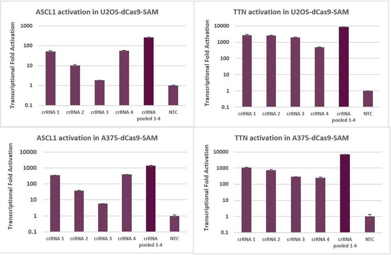 Figure 3. Activation with synthetic crRNA and MS2 tracrRNA: Cells were plated at 10,000 cells/well and were transfected using DharmaFECT 4 (U2OS-dCas9-SAM) or DharmaFECT 1 (A375-dCas9-SAM) Transfection Reagent with synthetic crRNA: MS2 tracrRNA (25 nM) targeting POU5F1, TTN, and ASCL1 genes. Cells were harvested 72 hours post-transfection and the relative gene expression was measured using RT-qPCR.